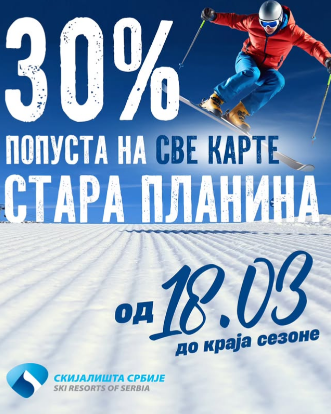 Od srede 18. marta u ski centru Stara planina važiće popust od 30%. Karte sa pripadajućim popustom se mogu kupiti…