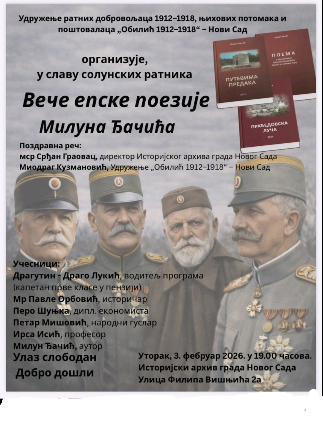 Veče epske poezije Miluna Đačića Udruženje ratnih dobrovoljaca 1912–1918, njihovih potomaka i poštovalaca „Obilić 1912–1918“ – Novi Sad organizuje, u…
