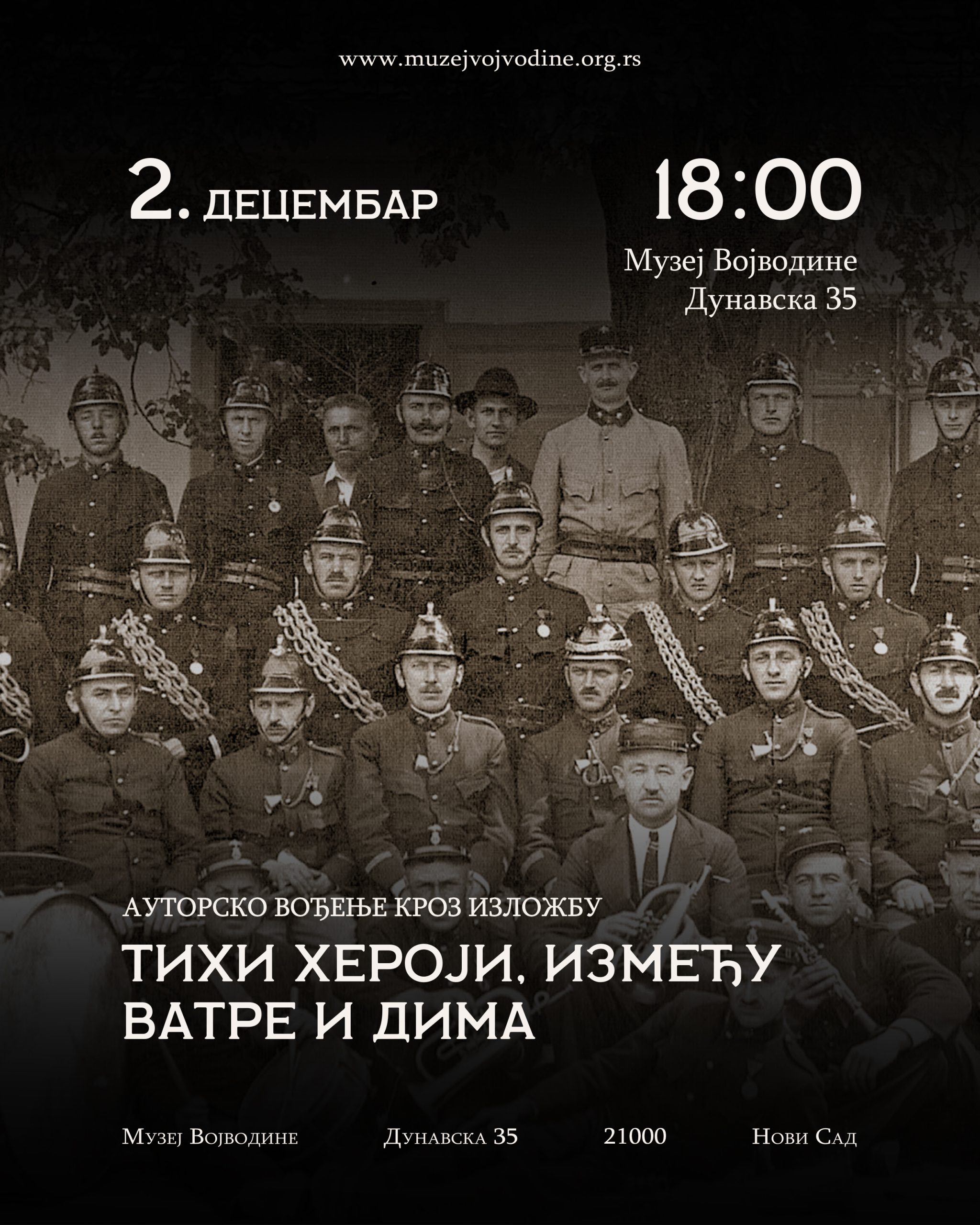 Pozivamo Vas na autorsko vođenje kroz izložbu „Tihi heroji – između vatre i dima, dobrovoljna vatrogasna društva na prostoru Vojvodine od polovine 19. veka do 40-ih godina 20. veka“, autorki Čarne Milinković, Milkice Popović i Mirjane Lakić, u utorak 2. decembra u 18 časova (Dunavska 35).