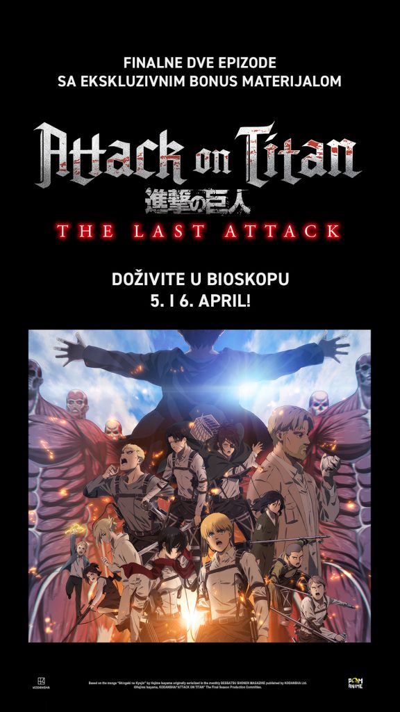 3. „Attack on Titan the Movie: The Last Attack“ 5. i 6. aprila na bis zbog velikog interesovanja – Ovo je konačni napad! Smešten u svet podeljen zidom, „Attack on Titan“ prikazao je beskrajnu borbu između čovečanstva i Titana. TV anime serija, koja je postigla ogroman svetski uspeh zajedno sa originalnim stripom, doživela je spektakularan završetak u jesen 2023. godine. Sada se Završna poglavlja, Prvi i Drugi deo, vraćaju u dugometražnoj verziji na veliko platno! Pored unapređenih scena koje je lično reditelj Juičiro Hajaši doterao, ovaj dugometražni film od 144 minuta posebno je prilagođen bioskopskoj projekciji sa moćnim vizuelnim efektima i surround zvukom.