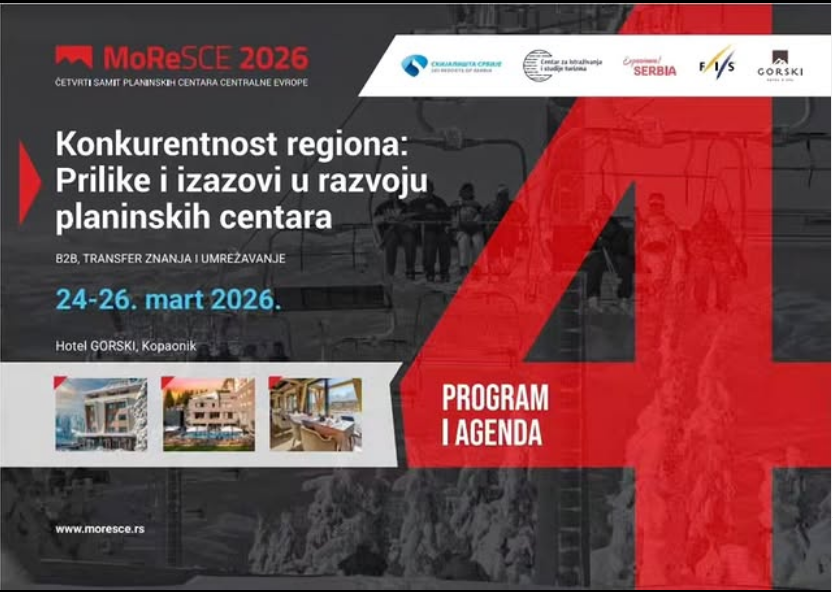 Skijališta Srbije i Centar za istraživanja i studije turizma će na Kopaoniku od 24. do 26. marta 2026. godine biti domaćin četvrtog MoReSCE samita planinskih centara Centralne Evrope, događaja koji iz godine u godinu potvrđuje značaj ski-centra Kopaonik kao jednog od ključnih mesta susreta turističke i infrastrukturne struke u regionu.