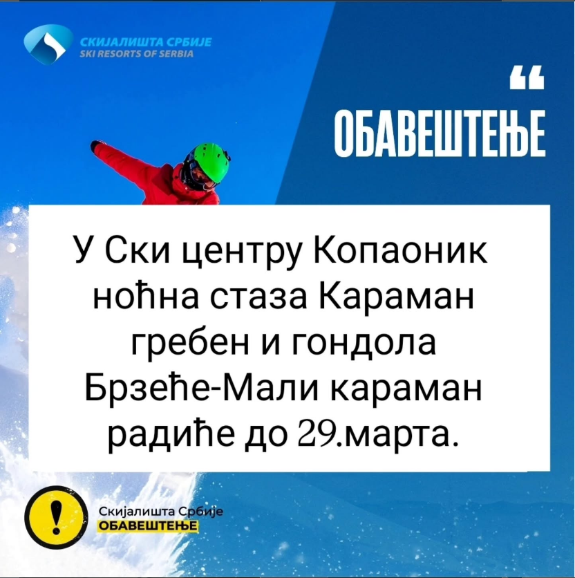 • Skijališta Srbije: U Ski centru Kopaonik noćna staza Karaman greben i gondola Brzeće-Mali Karaman radiće do 29. marta